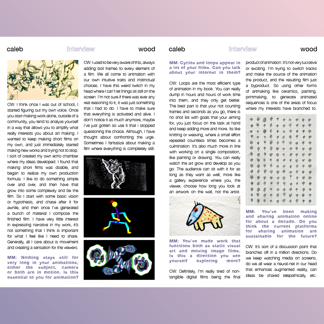 In this issue, Caleb Wood discusses his creative process and shares an anecdote that lead to the creation of his 2013 film "Bird Shit" in his essay titled "Looking at Shit: Conception of Ideas". Anna Firth relates her animation practice to the post-graduate routine she currently finds herself in with her essay titled "Frame-by-Frame". Both also answer a few interview questions.